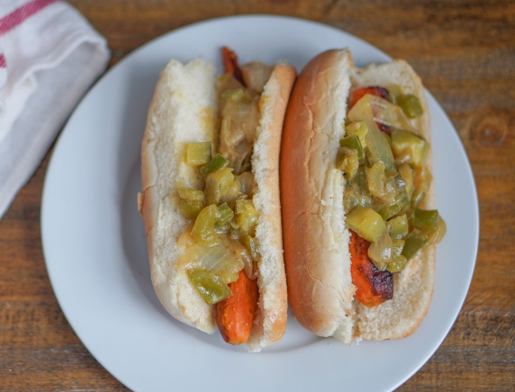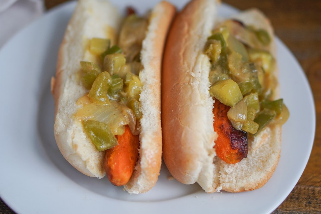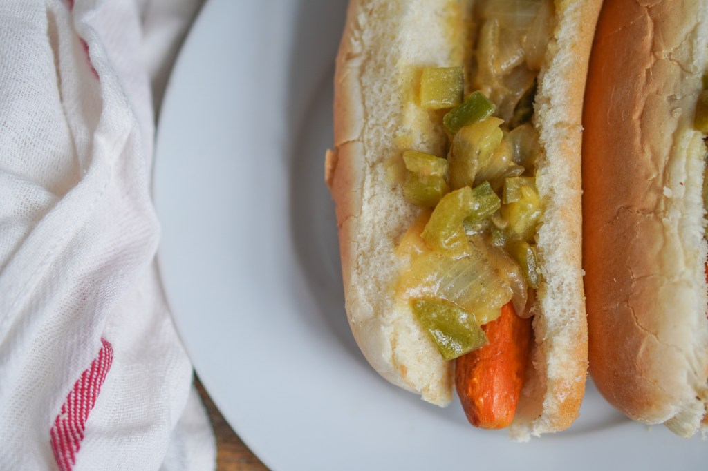 Relish can come in different textures and flavors, but I like mine a little chunky, a little sweet, a little salty, and a whole lot of sour! And for those of you (I know you’re out there) who don’t like green peppers, green peppers are, as the kids say, BoMb in relish. So, if anything, make these just so you can eat the relish.