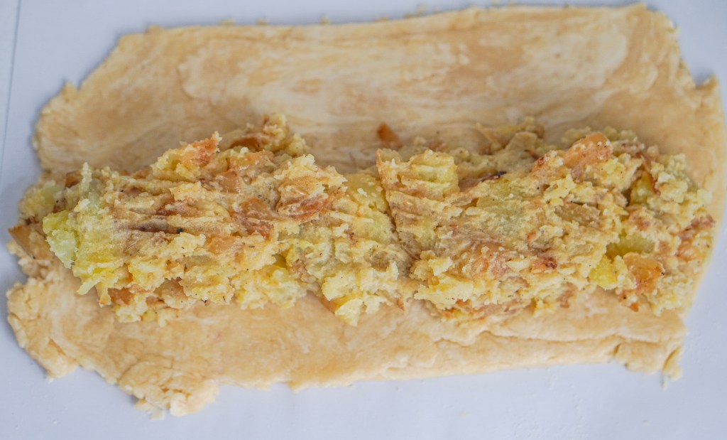 9. Now, add potatoes onto one side of the dough. Do not spread them out over the whole surface and do not over stuff the dough.