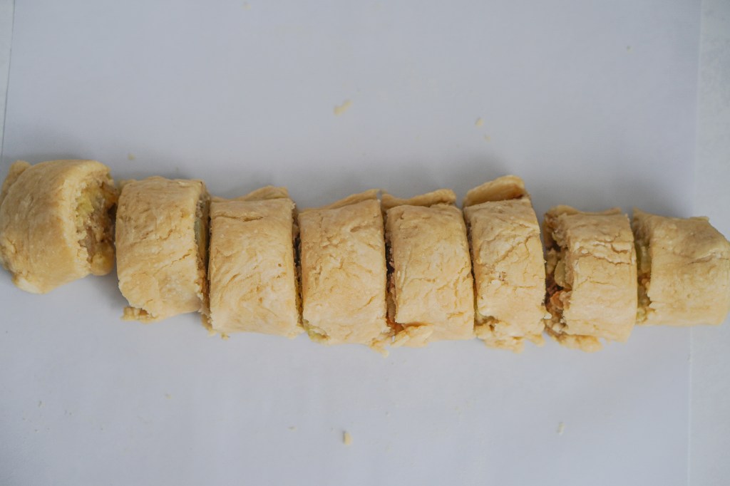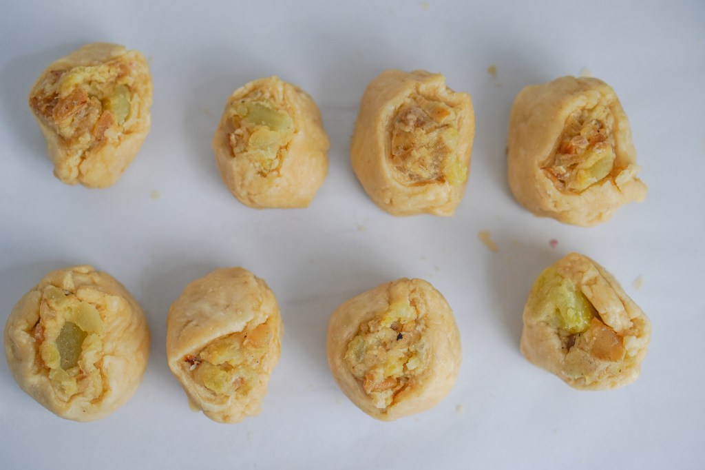 11. It’s time to cut the knishes! Cut the dough into about 1 inch pieces. You do not have to seal the tops, but try to make them as round as possible.